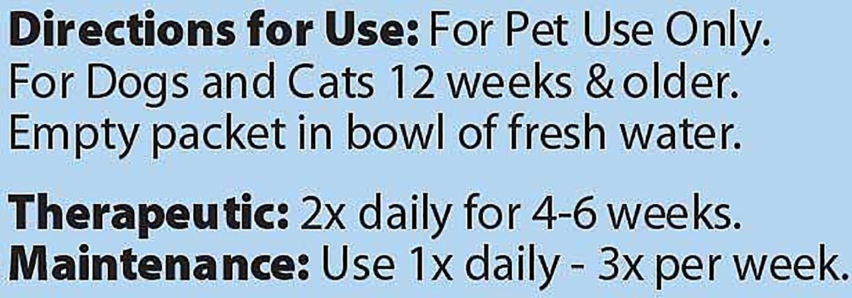 To use, empty a packet into 12 to 16 ounces of fresh water. It can be added to pet water fountains, but does not work when added to food.