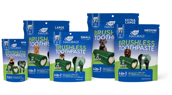 Brushless Toothpaste dental chews clean teeth and freshen breath. These 4-in-1 dental chews have a chewy toothpaste center to polish the teeth, and their unique texture helps clean along the gumline and reduce plaque and tartar.