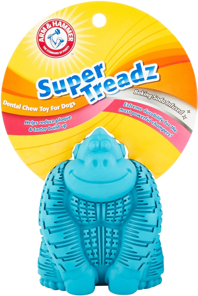 ARM & HAMMER PRODUCTS Super Treadz Tough Dog Chew Toy, Gorilla, Large—The Arm & Hammer Super Treadz Dental Dog Toy helps keep your dog’s teeth clean while he plays. These toys are the ultimate, durable dental toy for your pet. They are specifically designed to help freshen breath, stimulate gums and reduce tartar and plaque buildup, while the extremely durable body withstands even the most aggressive of chewers. These adorable and beneficial toys are sure to keep your pup busy for hours while the baking soda-infused rubber body works to gently clean and freshen their teeth.