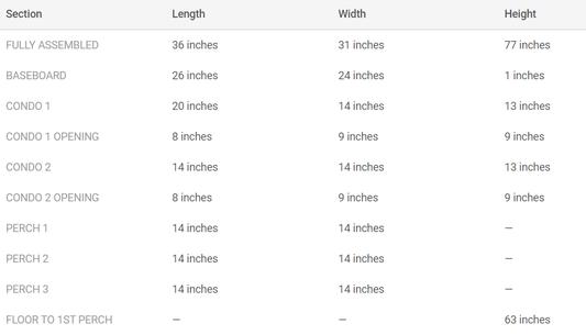 The perches measures 14 inches long x 14 inches wide. Please refer to the photo below for complete product dimensions: