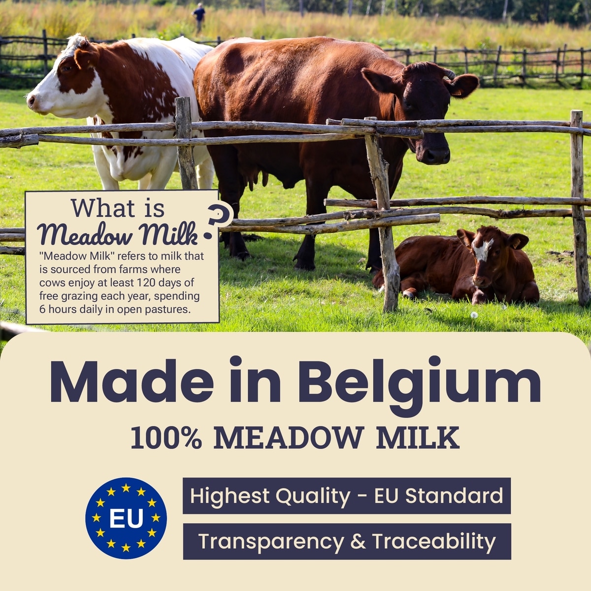Made from 100% meadow milk, we work directly with local farmers within a 200km radius of our factory in Belgium to deliver ethically-sourced treats that are clean, traceable, and made with real purpose.