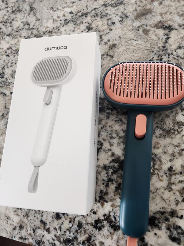 I was gifted a Aumuca slicker brush almost 4 years ago. It is still in almost daily use, and has proved to be so durable and the cats love it that I just obtained this second brush. I have an older semi-feral cat (Puffy) who has long hair prone to clumping and knotting. After some patient work she now comes running when I rub the brush on my leg. I love the lengthy handle, long, flexible bristles and, most importantly, the “self clean” feature. Simply pressing the button on the handle retracts the bristles so you can easily gather the hair. The flexible bristles allow removal of even tough hair clumps without causing her pain. Amazing durability and value!