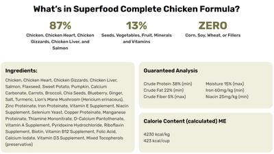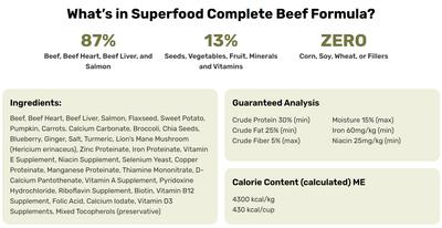 Superfood Complete contains some of the healthiest foods on Earth—beef, nutrient-dense organ meat, salmon, and gut-healthy vegetables. And, of course, a variety of superfoods, chosen to help support your dog’s smooth digestion and overall health. All these ingredients are cooked responsibly at low temperatures and air-dried for maximum nutrition. Superfood Complete contains no fillers or artificial preservatives—just all the good stuff your dog needs to thrive!
