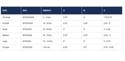 To determine the correct size for your pet, use a flexible measuring tape and measure while your pet is standing. Measure the circumference of the upper thigh (measurement A), measure the circumference above the hock (measurement B), and measure the distance between the knee and the base of the hock (measurement C). Then compare these measurements with the size chart below: