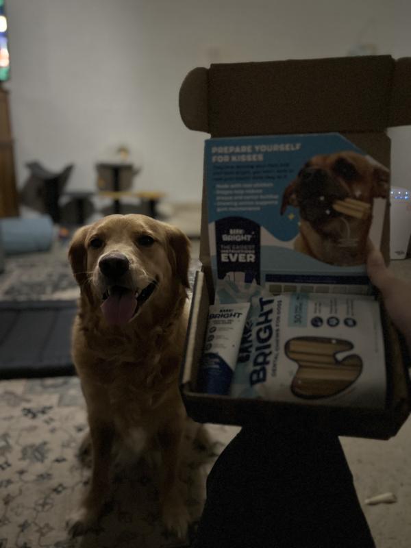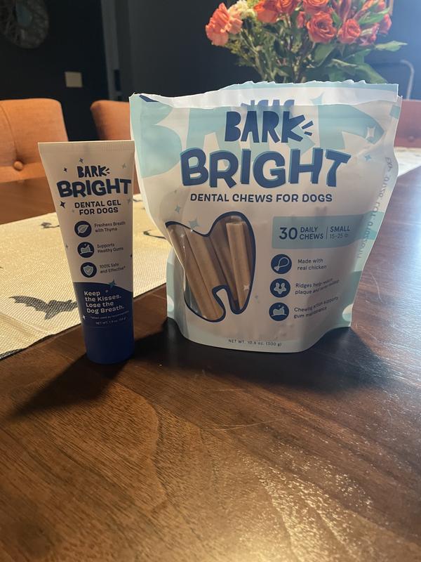 Say Goodbye To Doggy Breath Dive into the Bright dog breath freshener experience with Bark dental chews and gel. Enriched with flavors of chicken and thyme, this Bark dental kit helps you say goodbye to doggy breath and hello to brighter, healthier smiles.