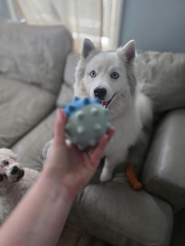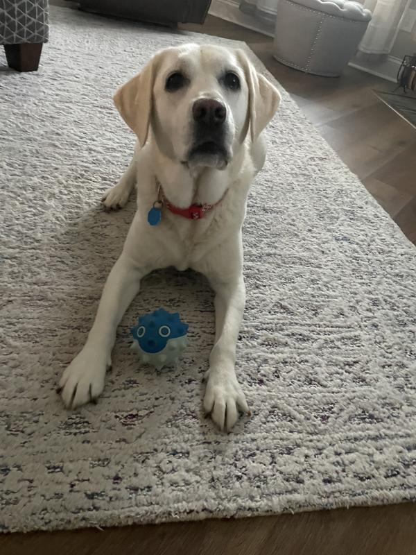 Our Border Collie LOVES this toy! I like that it is blue in color as it is easier for dogs to see. The toy has a little weight to it, a whimsical “face” and knobs