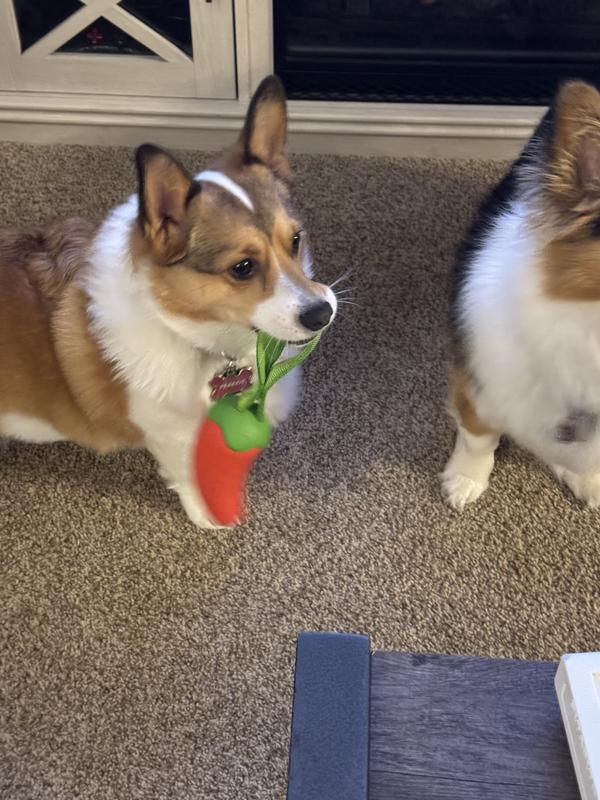 Great tough toy for our big little chewers! Our corgis tend to chew through most toys made for their size within a couple of hours. This one is still going strong