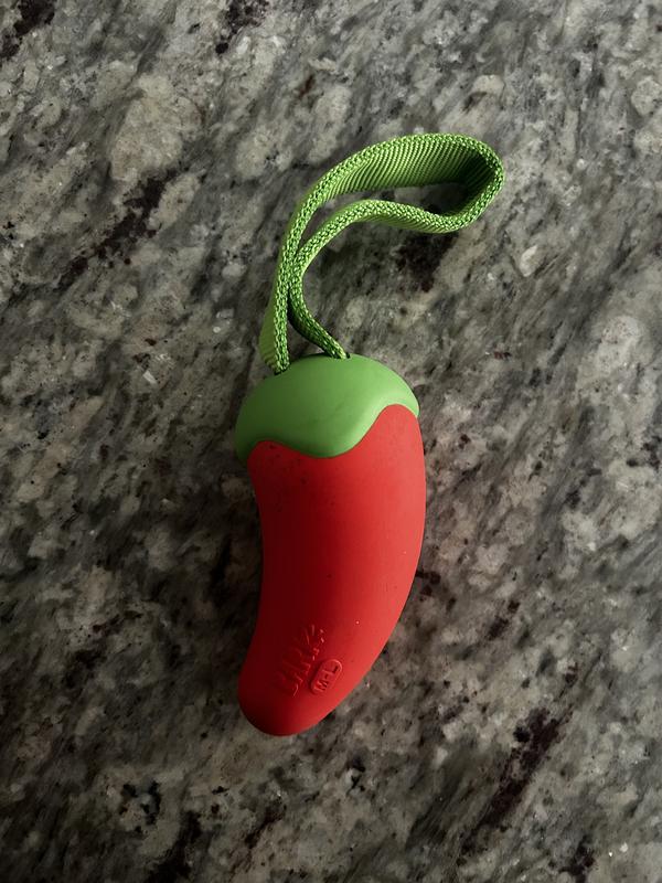 Loved this because I am a hot pepper aficionado but both of our dogs never took to it (4yo Siberian Husky, 8yo Terrier mix). Very well constructed with heavyweight and slightly pliable body and a heavy duty tug strap. I have no doubt it would have held up well to my Husky if she were a ‘chewer.’