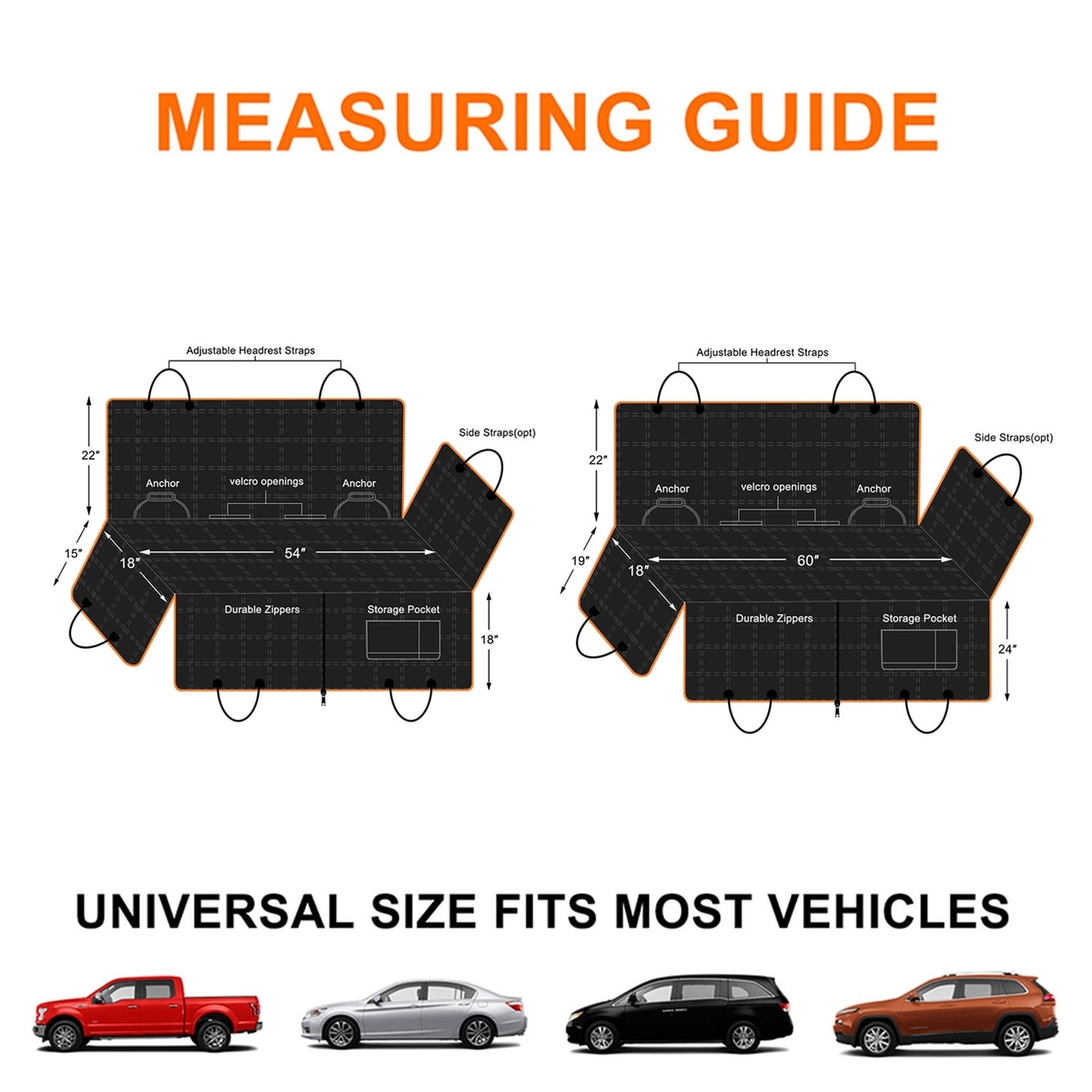 The seat cover comes in two sizes: 54"W × 58"L — fits most cars, sedans, small SUVs, and crossovers. 60"W × 64"L — ideal for larger SUVs, trucks, and vehicles with wider rear benches. If your back seat is between the two sizes, choose the larger one for full coverage.