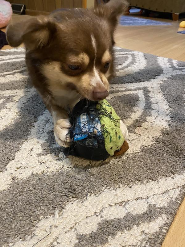 This toy is super cute but I really expected the materials to hold up better to chewing. My 35 lb lab mix had it destroyed in less than a day. The black part shreds like one of those blue tarps when they fray. But if you don’t have a dog that’s a big chewer I’d recommend!