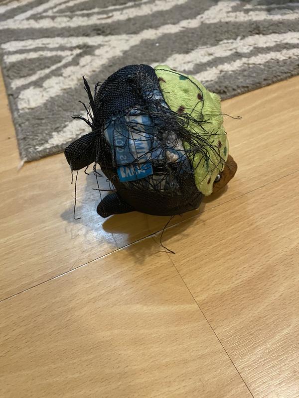 This toy is super cute but I really expected the materials to hold up better to chewing. My 35 lb lab mix had it destroyed in less than a day. The black part shreds