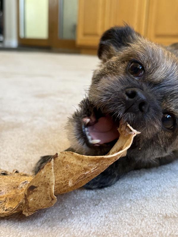 Murphy recently had a back molar removed. He’s a chewer so we needed something softer and chewable that would last. This cow ear was the answer. However he licked