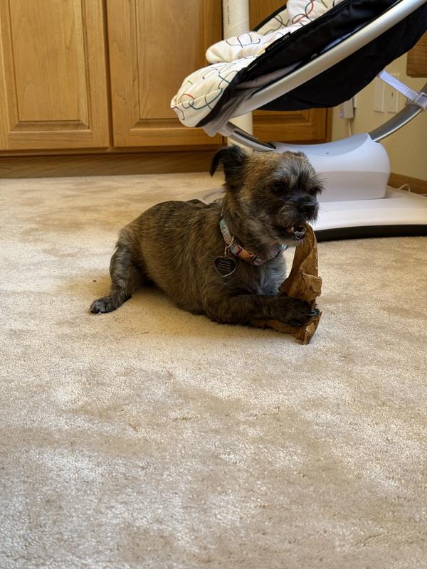 She was a bit sketched out about the cow ears at first but then she picked the peanuts and started digging it and after her first munch she ate it uppppp. She went