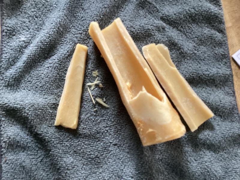 My Olde English Bulldogge did this to this bone within a couple hours of opening it. I am so glad that I was home and near her to hear the crack and the breaking
