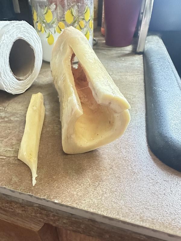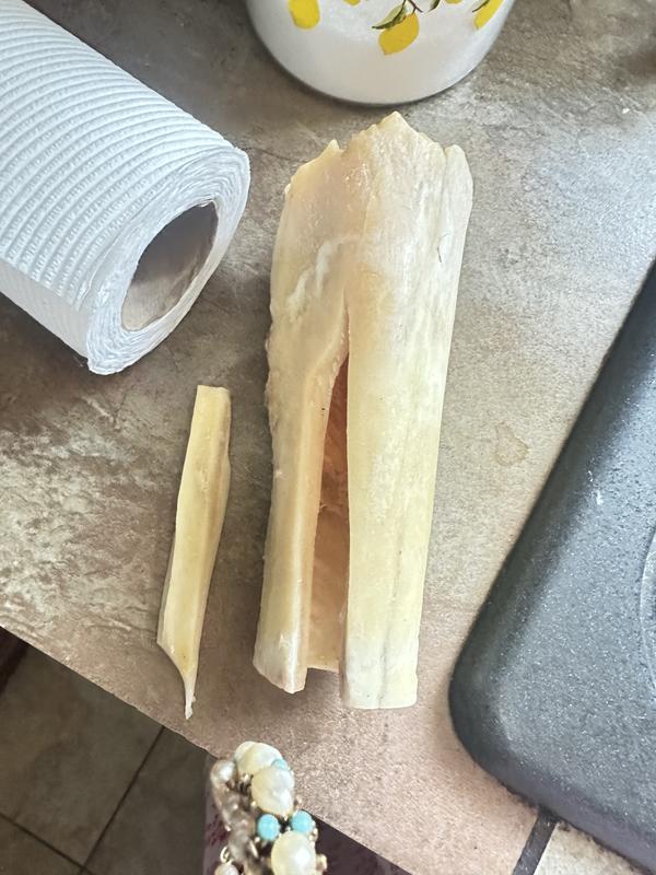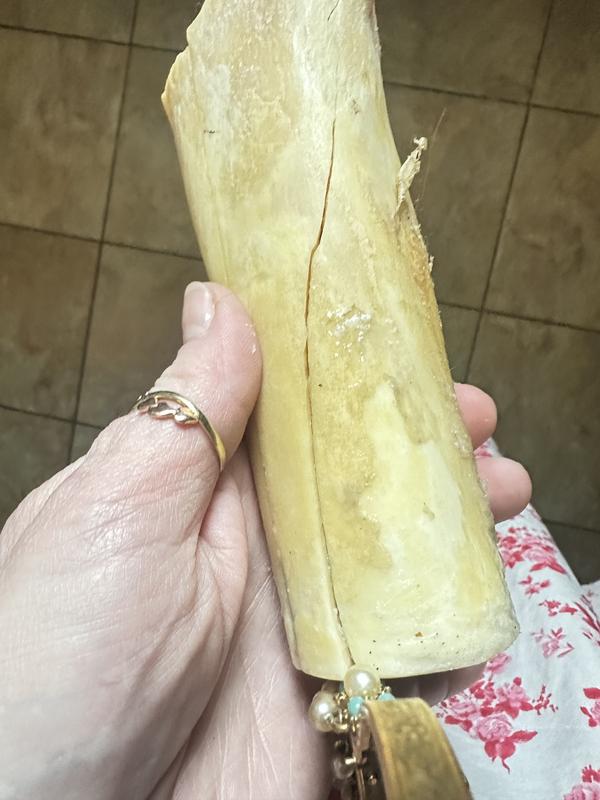 My 46 pound female standard poodle had this for less than five minutes and it shattered and splintered. I hope she did not ingest any of it, she seems fine so far. I also purchased the knuckle which I will not give to her either, do not want to take the chance of this happening again. Have never had issues with anything else ordered from chewy.