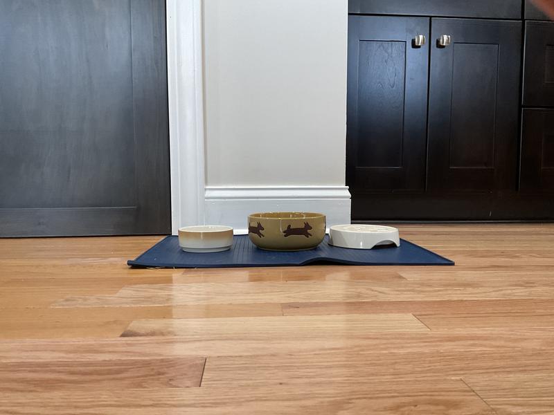 This mat is designed with a gripper dot pattern to prevent dog bowls from sliding. It can be used on both carpets and hardwood floors.