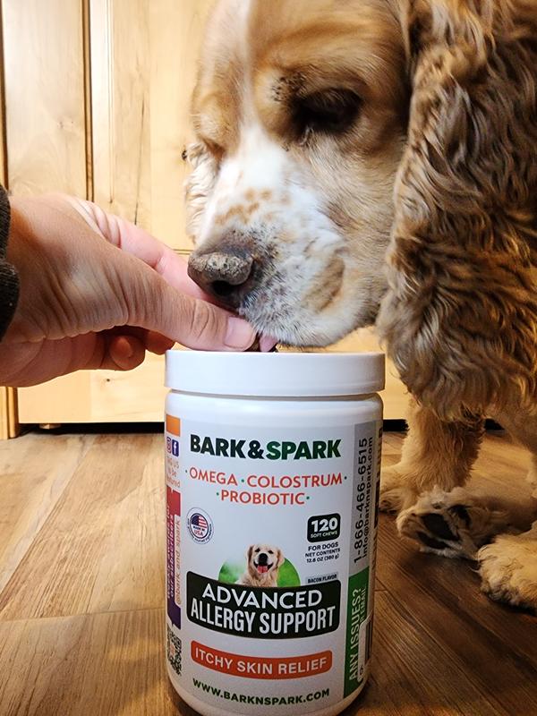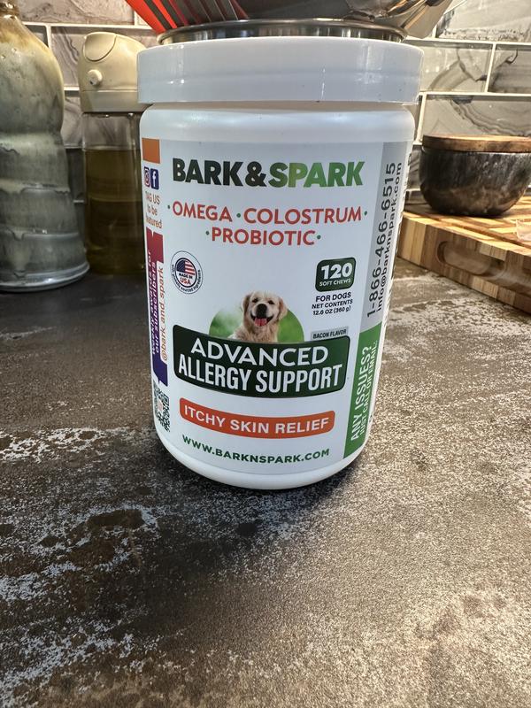 This supplement certainly has catchy titles: Advanced Allergy Support OMEGA COLOSTRUM PROBIOTIC Really? Im referring to the colostrum as a touted ingredient. The very first mother's milk ( that's what colostrum actually is! ) is being touted as a prominent ingredient. Other than the use of this fashionable buzzword, the supplement is just fine. They seem to provide some itch relief already, after only two weeks use. The smell and tast of the "treats" is agreeable to my dog. He's a picky eater, but if it comes from my hand, he'll gobble it. I'm thinking I should have gotten the subscribe and save. The supplement at full price is a little expensive, but a monthly subscription on chewy would have cut that price in half almost. Yes, I think I should have subscribed. The supplement is good. Does what it claims. My dog's fur is smoother, and rough patches are growing back in nicely already, simply from less scratching. I think this product is helping. If my opinion changes after a time, I will update. Four out of five stars. One deducted for use of "buzzword", as I mentioned. Thank you bark & spark, for becoming a reliable brand of pet supplies!