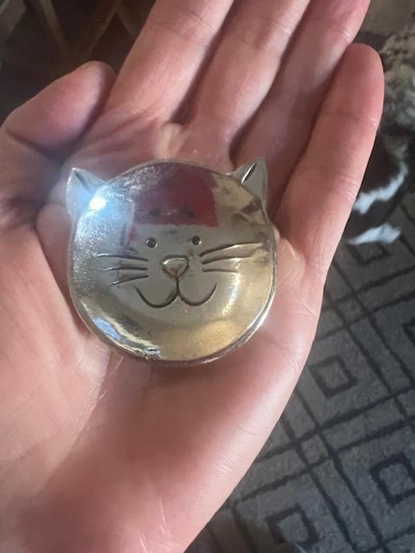 This trinket dish is adorable! It’s a small size to hold jewelry, treats, or change. I love the silver quality. It’s a good weight for the size of the dish. The cats face is perfectly imprinted in the metal. It comes in a cute blue box with a silver paw on the top. This would make a great gift for a cat lover of any age. The silver is nice and shiny.