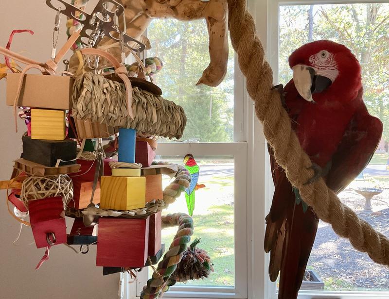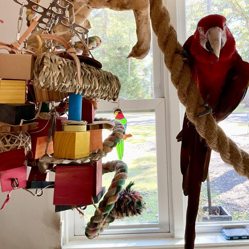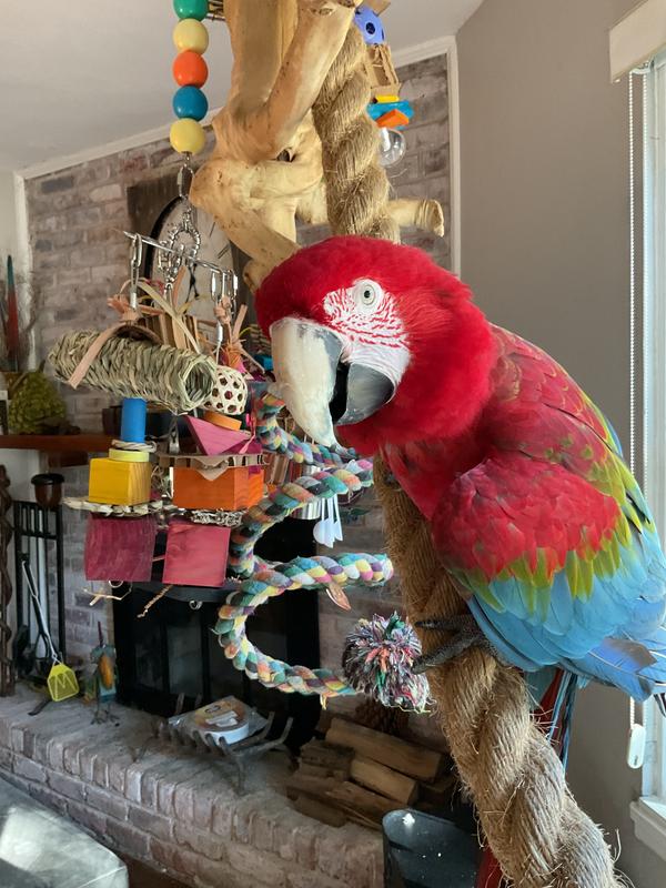 I have an adult military macaw. It did take him a little while to get used to it, but that has nothing to do with the toy. Now he loves it!!! There are so many places