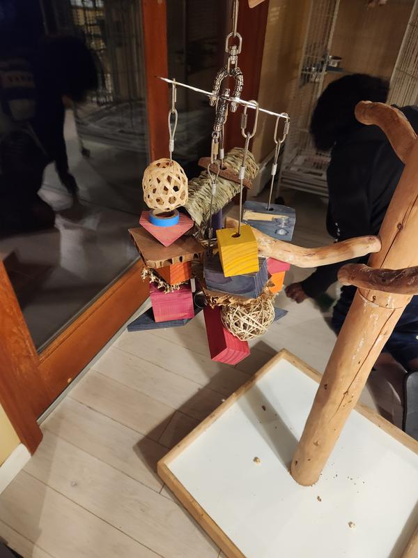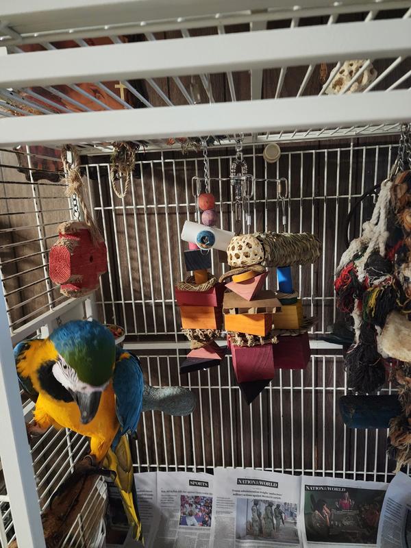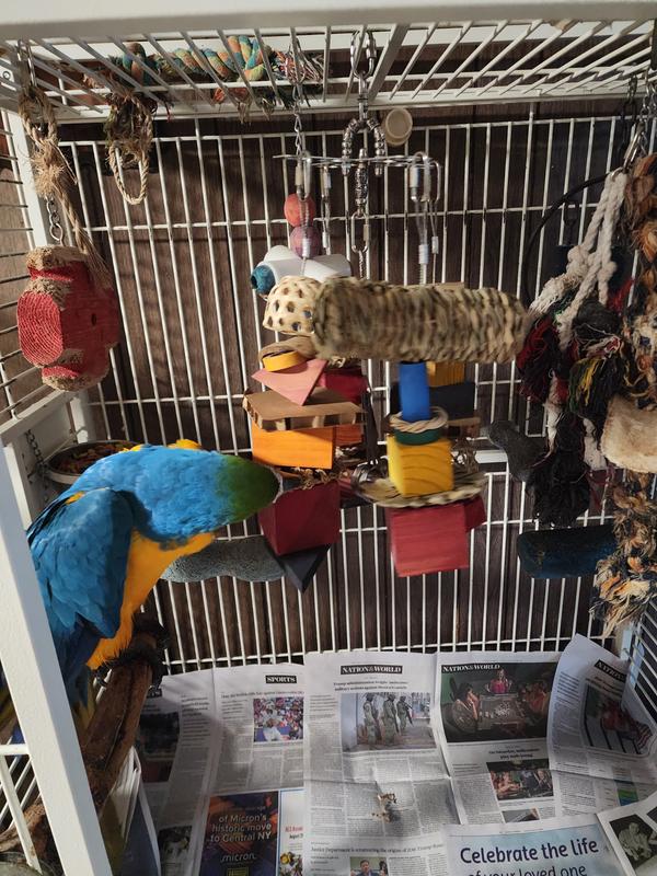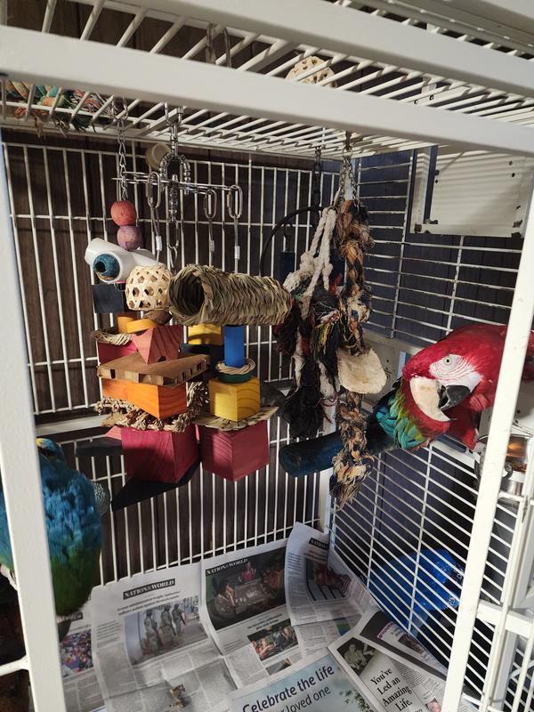OMG my bird loves this toy so creative and get creative with it she loves playing with it and hanging from it her favorite the shiny measuring spoons her favorite