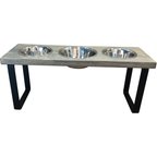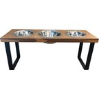 I was impressed with both the platform with the pre-cut holes for the bowls and the metal legs. The darker wood goes well in our dining area, and it cleans up well