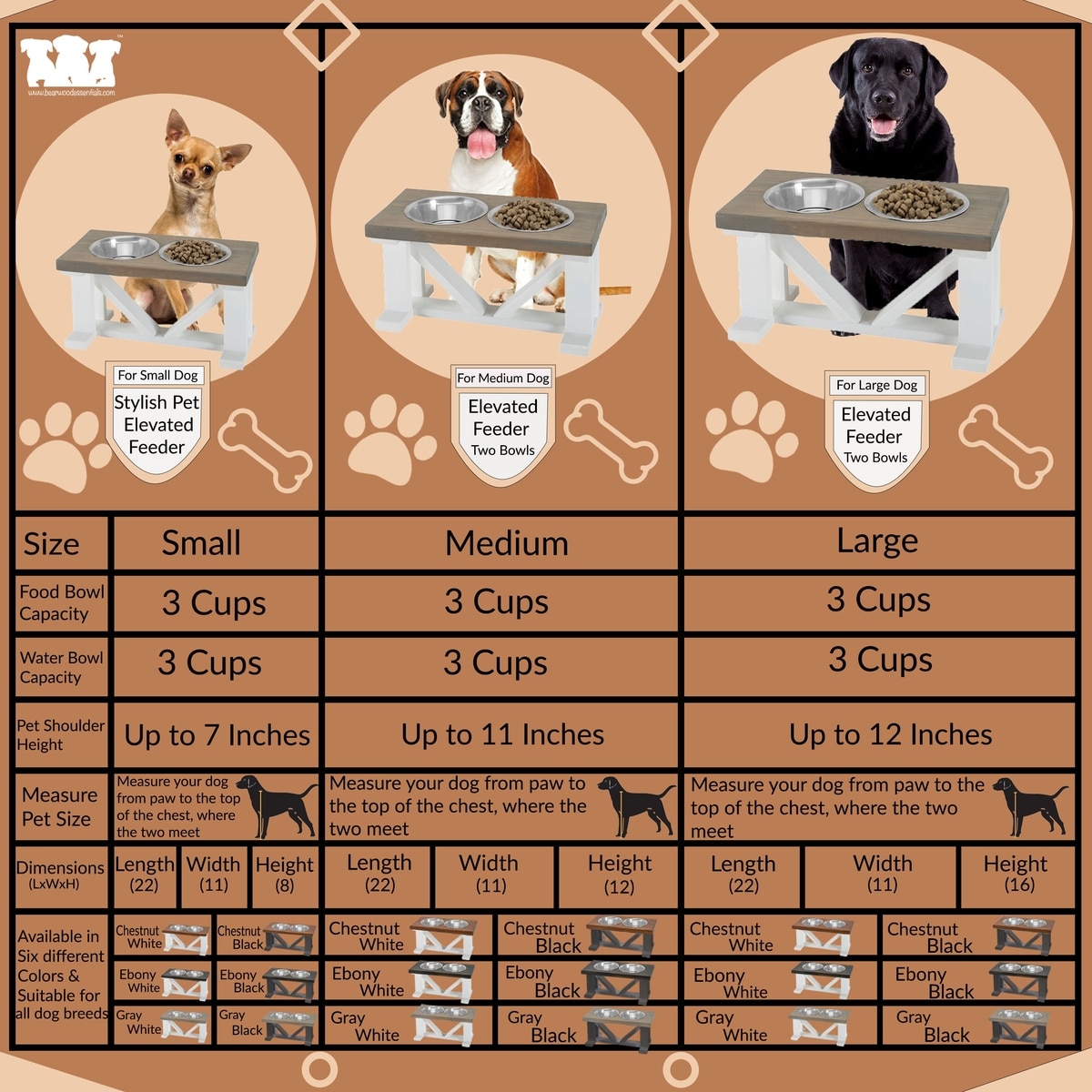 This elevated dog feeder looks good in our dining area, good quality, sturdy a good height for our medium size dog. Bowl size is fine non issue for me.