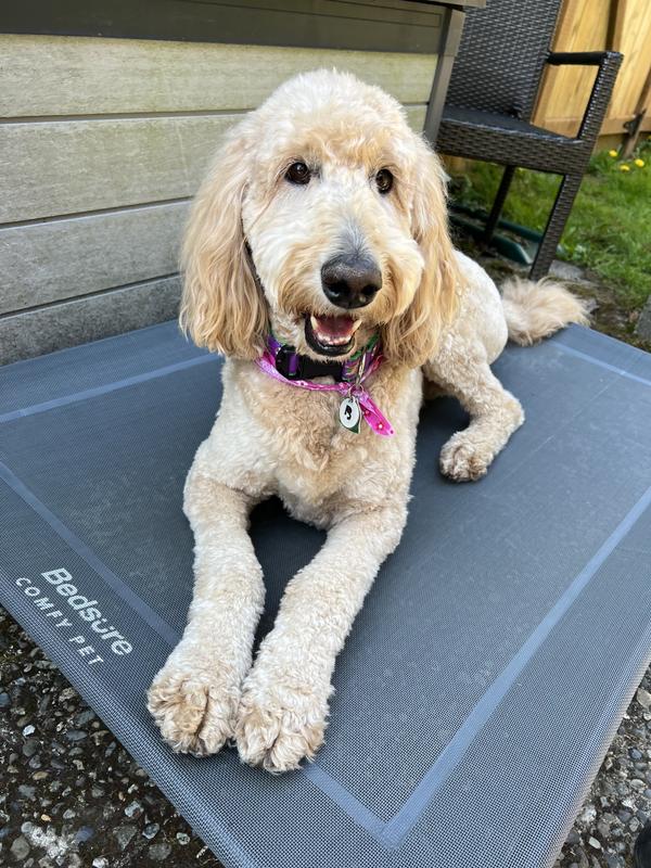 This outdoor bed is amazing! The size is perfect for a large dog, I love that its lifted off the ground so airflow keeps our dog cool and he finds it to be rather