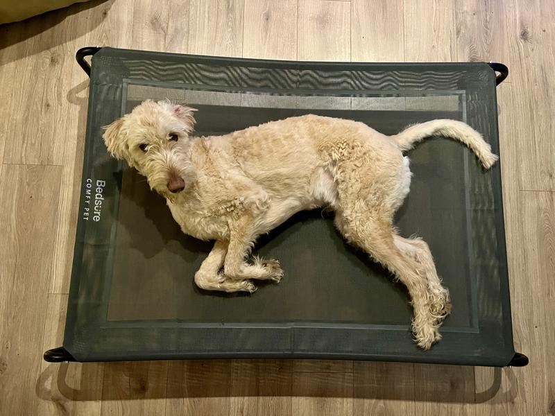 This outdoor bed is amazing! The size is perfect for a large dog, I love that its lifted off the ground so airflow keeps our dog cool and he finds it to be rather comfy!
