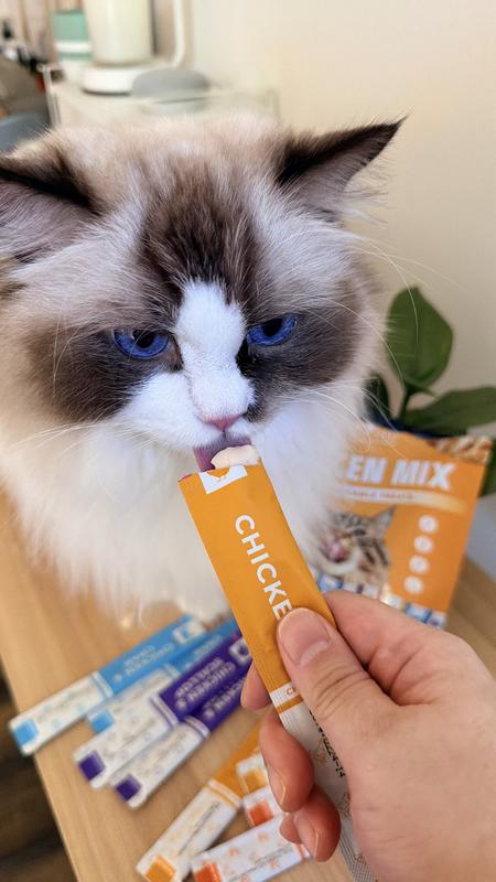 • Features a premium mix of chicken-based lickable cat treats with added seafood flavors like salmon, crab, shrimp, and scallop.