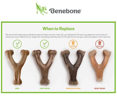 Since it’s a durable nylon chew, Benebones are pretty hard and durable. You can’t make an indent on the product with your fingernail, however hard you try. So be sure your pup has strong, healthy teeth and can handle harder chews such as antlers and real bones. Keep an eye out for wear and tear. Within a month or so, most dogs chew Benebone into submission. Rice-sized flakes are okay, but if it looks like larger chunks are about to come off, it’s time to replace them. Please check the image for reference.