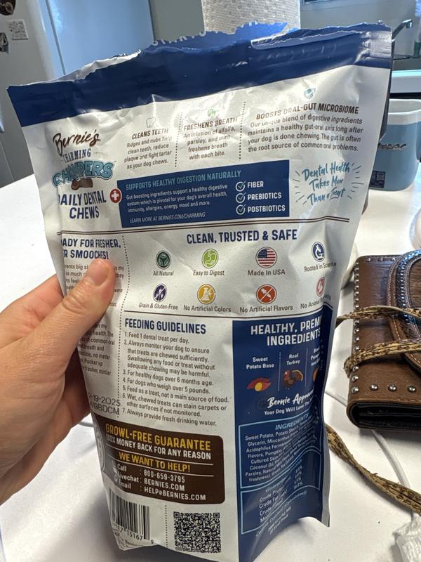 We were doing other brand dental chews but they gave him terrible gas. He isn’t had a problem since switching to Bernie’s.