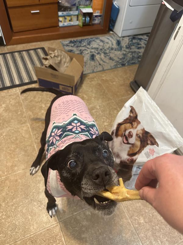 These were immediately popular with both dogs! They do not last very long (I have one pit and one lab) but they really liked chewing on them and they’re great as a special little treat from time to time. They don’t seem to have any unpleasant odor, which is great. I would imagine if your dog was a little smaller they would take a little longer to eat.