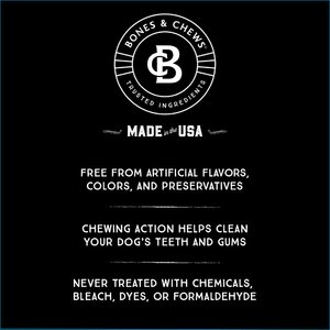 Real dog bones should not contain rawhide, but many rawhide chews are molded into the shape of a bone. Be sure to check the ingredients of any kind of chew you are considering giving your dog and know the risks inherent in each different type of chew. Chewy lists ingredients under the Nutritional Information section of our bone and natural dog chew listings, so you can find out exactly what's in each one.
