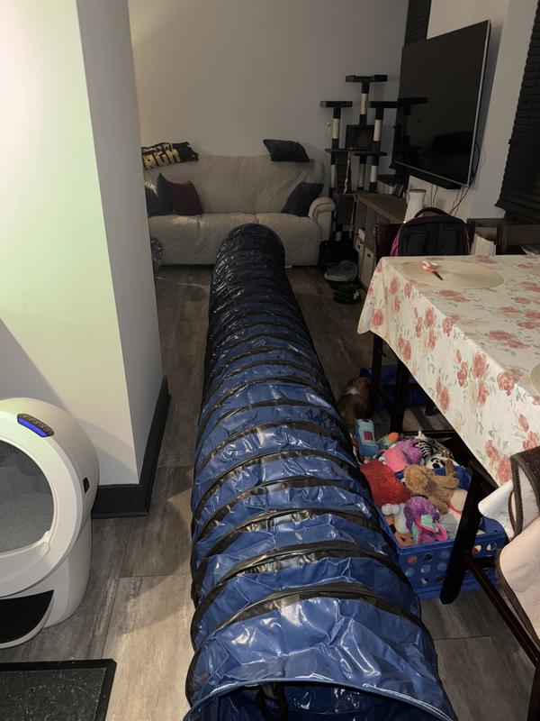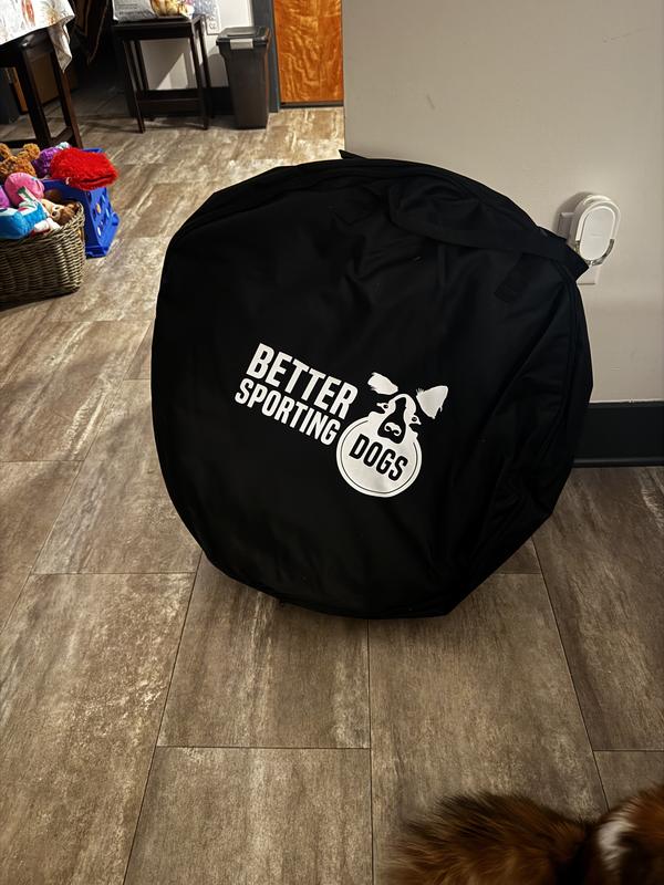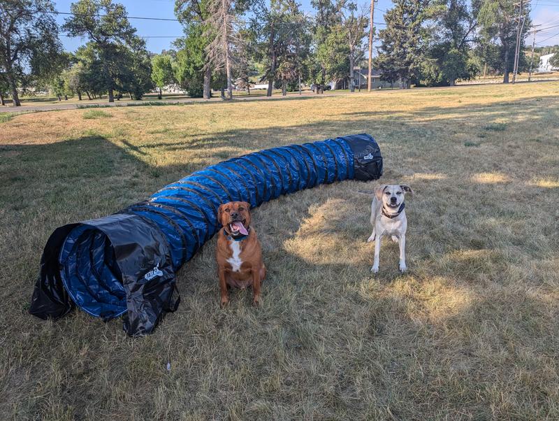 So excited to try this out! My dog is always bored, and have been thinking about trying agility course training to entertain her, and hopefully help her listen a little better. Set this up and laughed for the first thirty minutes as my chicken dog tried to figure out what it was and if she wanted to go in it. She’s going to need some training, but I think both of us will have fun with it. The product itself is fantastic quality. Comes with a compact carrying case that holds the tunnel and weight bags. The tunnel is easy to set up and put back into the carrier. The weighted bags show using sand, but I put 10 lb dumbbells in the pockets and that worked fine. My 59 lb dog was jumping on top of the tunnel and in the entrances and it held up great. Looking forward to using this tunnel to work with my dog!