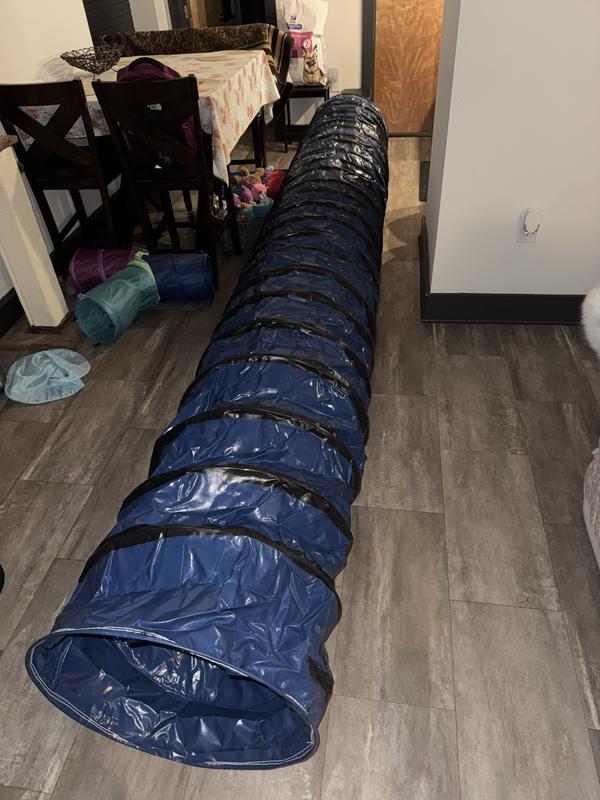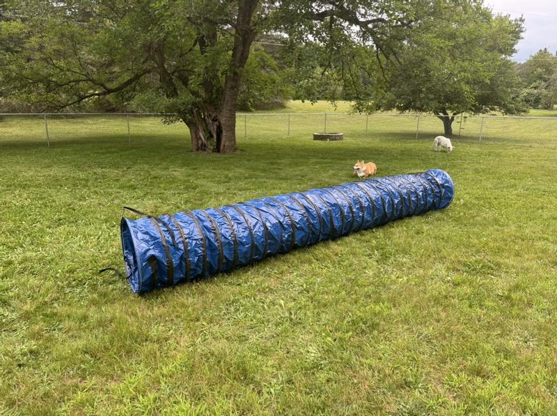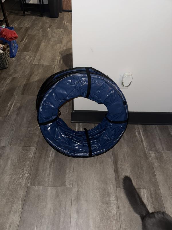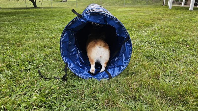 What do you buy an energetic puppy that isn't allowed to do most agility tasks at a young age? A tunnel! My little guy is working on building confidence and being less fearful, and the first time he made it through this tunnel, he jumped all over me and kissed my face. He was very proud of himself. The tunnel seems like it is high quality, and it is easy to store. I am using it inside of my house, so I don't know how it would hold up outside, but the fabric seems durable.