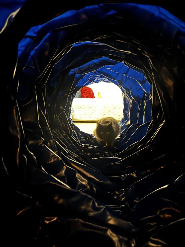 What do you buy an energetic puppy that isn't allowed to do most agility tasks at a young age? A tunnel! My little guy is working on building confidence and being