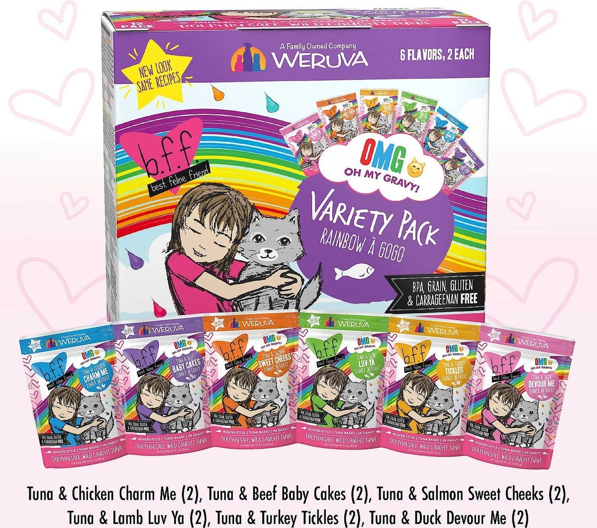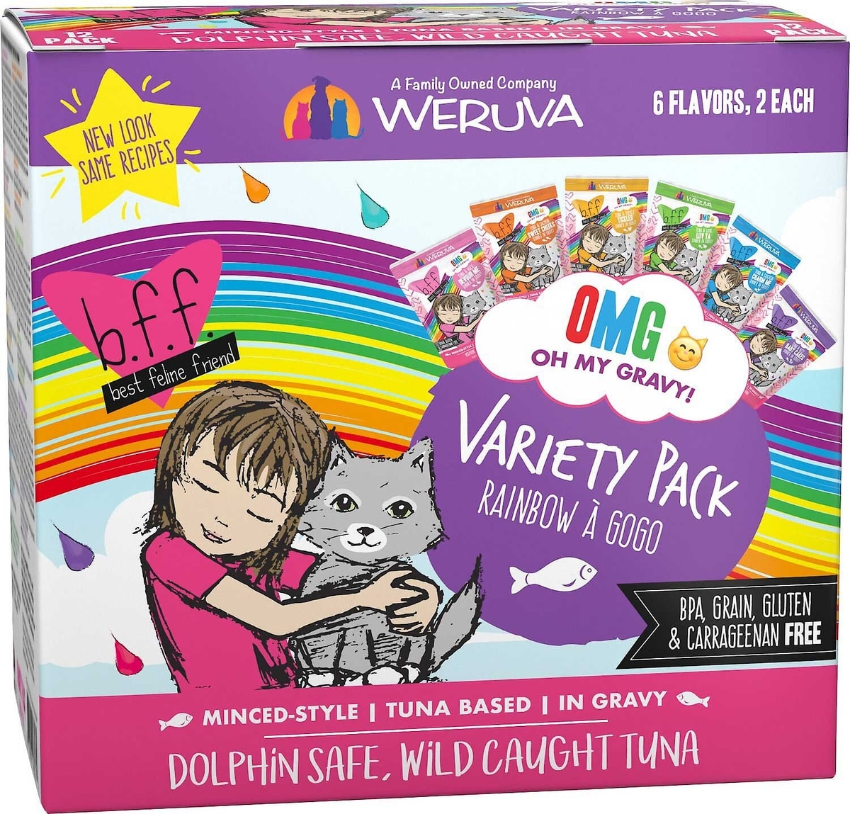 - BFF OMG Rainbow Road Variety Pack Grain-Free Canned Cat Food, 2.8-oz, pack of 12$19.99 Chewy Price$20.29 List Price$18.99 Autoship PricePromo, New Customers Only: Spend $49+, Get $20 eGift Card