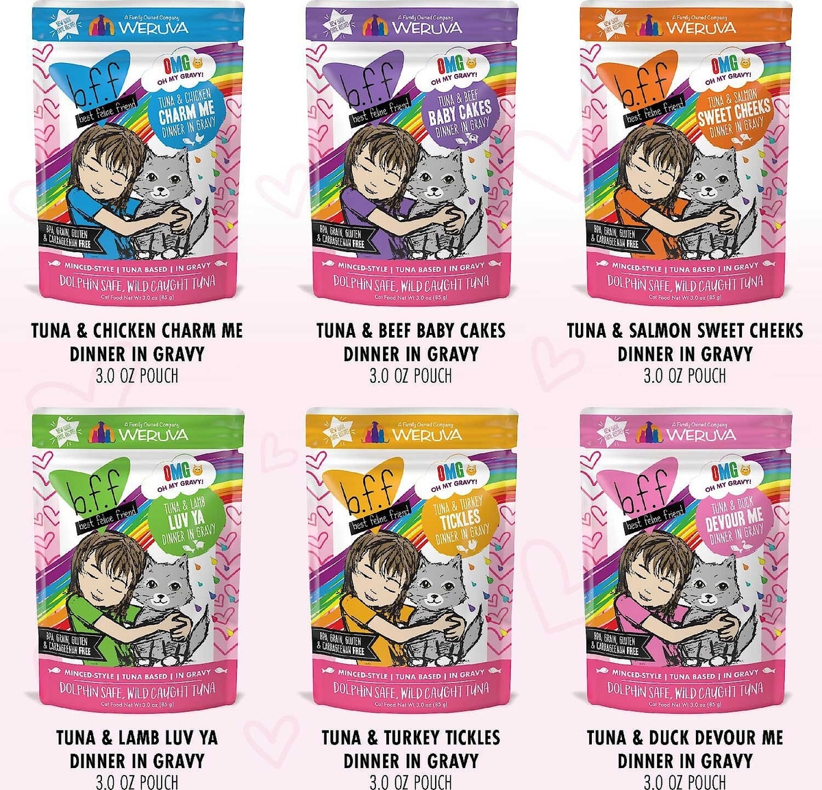 B.F.F. OMG Gravy recipes feature tender red meat tuna (wild-caught and dolphin-safe), wild-caught tilapia, boneless skinless chicken, or pumpkin. Made with no artificial flavors, preservatives, or colors, B.F.F OMG recipes are all-natural, grain-free, gluten-free, and carrageenan-free.