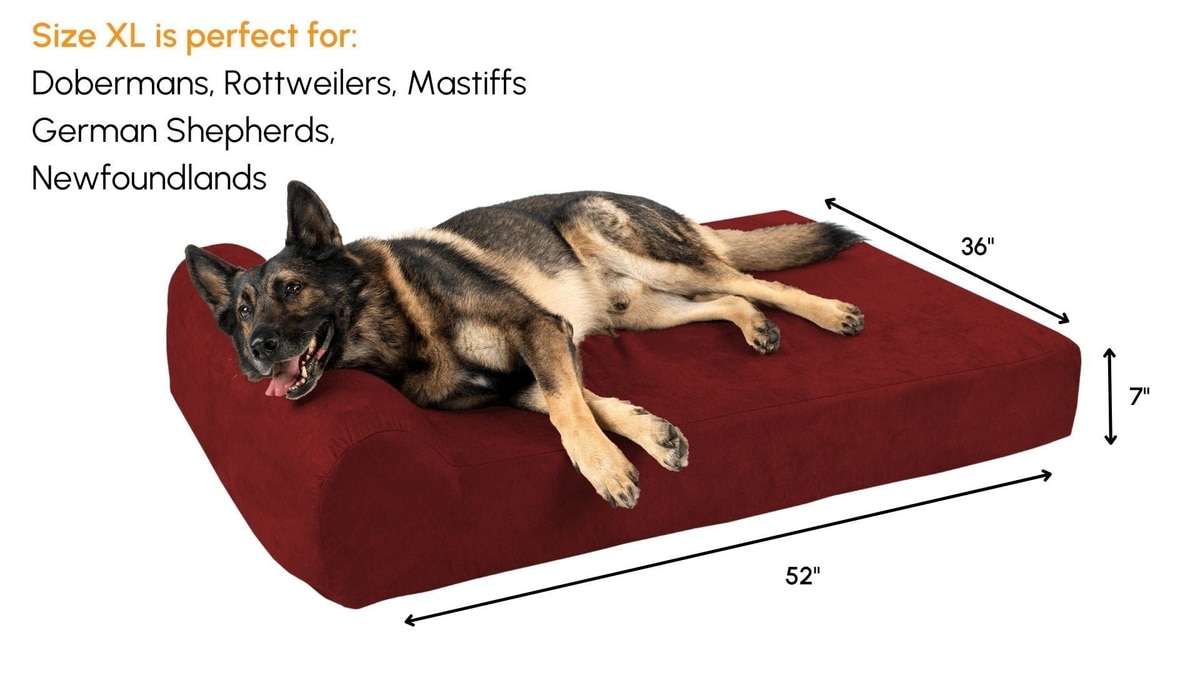 The most important measurement is the width of the bed. What you want to do is have your dog stand up straight, and measure from the bottom of the paw to the top of the hip or shoulder. This is the amount of room that your dog needs to be in a full 100% stretch position. Compare that measurement to the width of our sizes. You'll want an extra 3-4 inches. For example, if your dog measures 25 inches, you'll do great with the Large, which is 30" wide. But if your dog is 28 inches, you'll want to bump up to the 36-inch wide XL. Note: the foam composition is the same between the Large, XL, and Giant sizes. All 3 sizes can easily support a 300 lb dog if they have to.