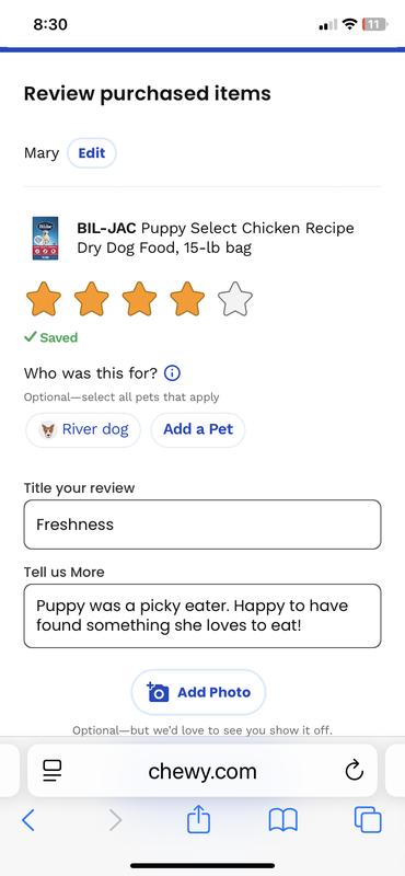 While you care about how nutritious your dog's food is, he craves another important thing: food he can't wait to eat.. And your pal will love the tail-wagging, delicious taste of fresh chicken in every bite of Bil-Jac. Don't believe us? Try the Two-Bowl Challenge. Place a small amount of your regular kibble in one bowl and Bil-Jac kibble in another - see which bowl your best friend empties first!