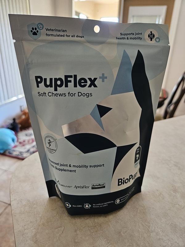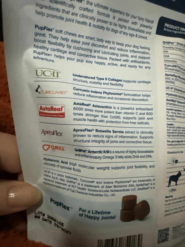 We used PupFlex+ for a month with our beagle mix Minnie. She loved the soft chews and acted like they were treats. They smelled like fish and contain krill Omega-3