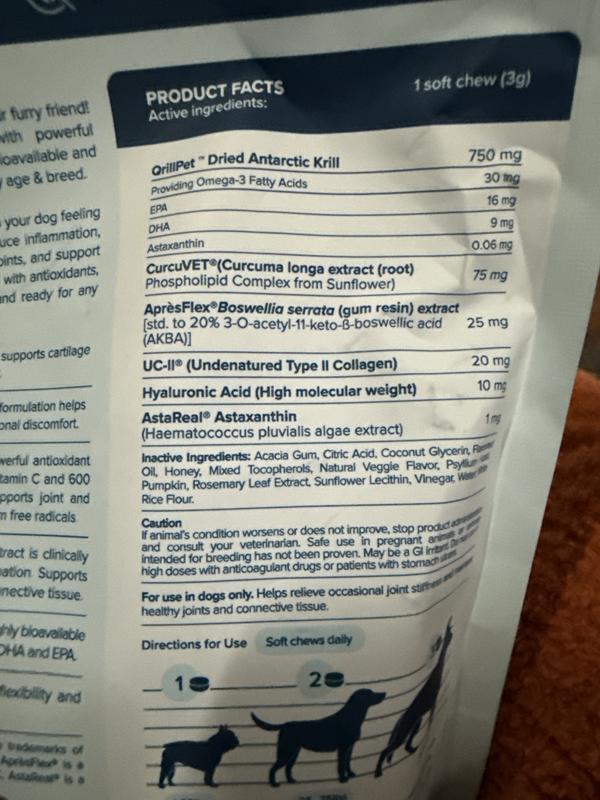 First I love how health packed this product is! On paper this is 100 what I’d want for my pet and it does seem to work as my 7 year old dog (lab mix) who is healing from a torn CCL seems to be doing even better since she’s been taking 2 of these for a few days. The problem, unfortunately my dog doesn’t seem to like them all that much and I’m not a huge fan of that Krill smell. My cats however go nuts when the bag gets opened. So I’d definitely recommend this product but my picky dog voted no.