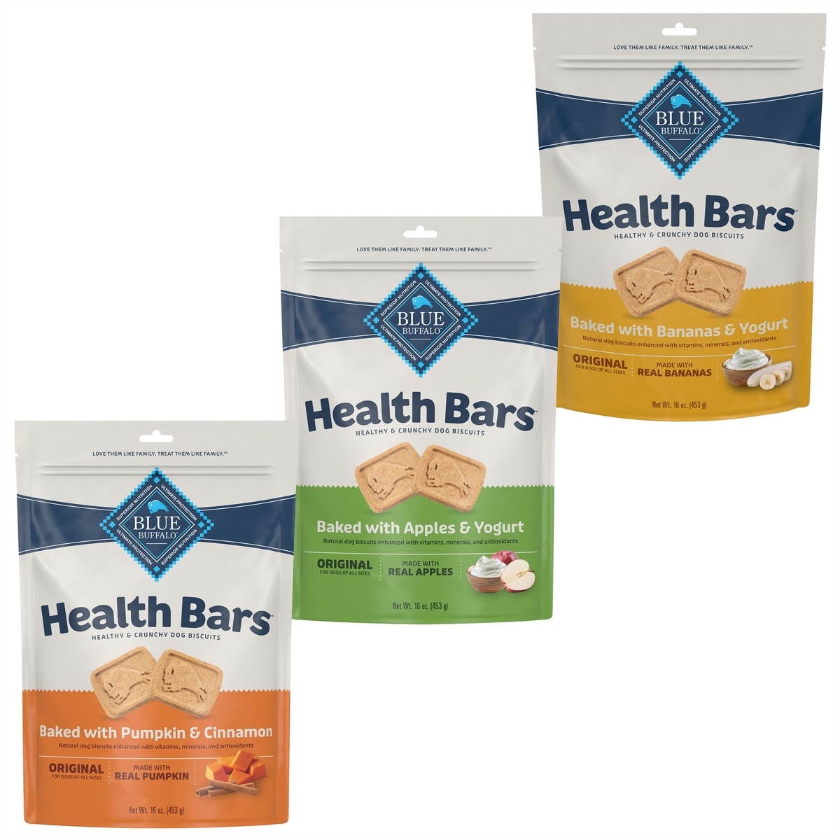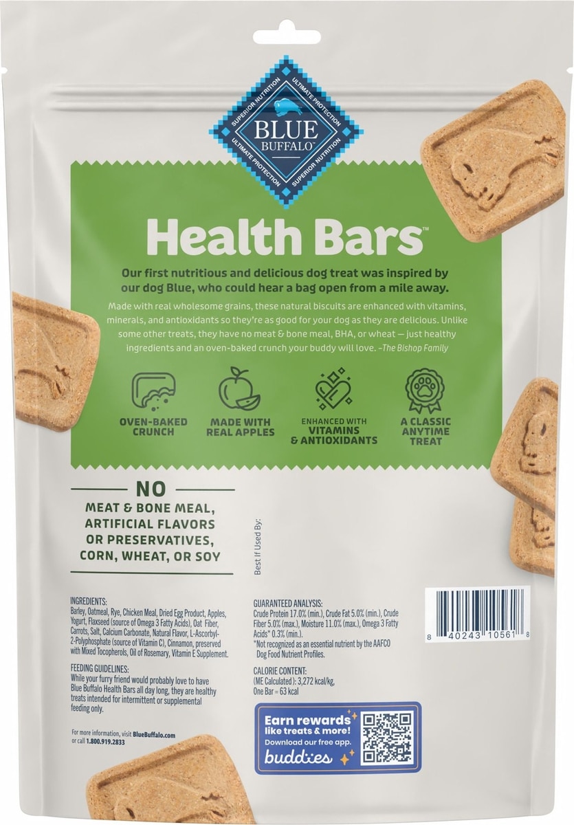 Blue Buffalo Health Bars Baked with Apples & Yogurt Dog Treats, 16-oz bag — A favorite of health-conscious pet parents, Blue Buffalo Health Bars deliver the great taste and satisfying crunch our furry friends love, but without the corn, wheat and soy, which means it's great for pups with sensitivities. They are made with the finest natural ingredients like apples, yogurt, carrots and more, plus fortified with omega-3 fatty acids, vitamins and antioxidants. Oven-baked for a big crunch, these treats are as nutritious as they are delicious!
