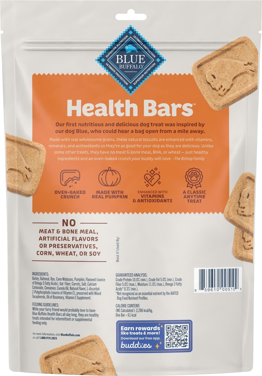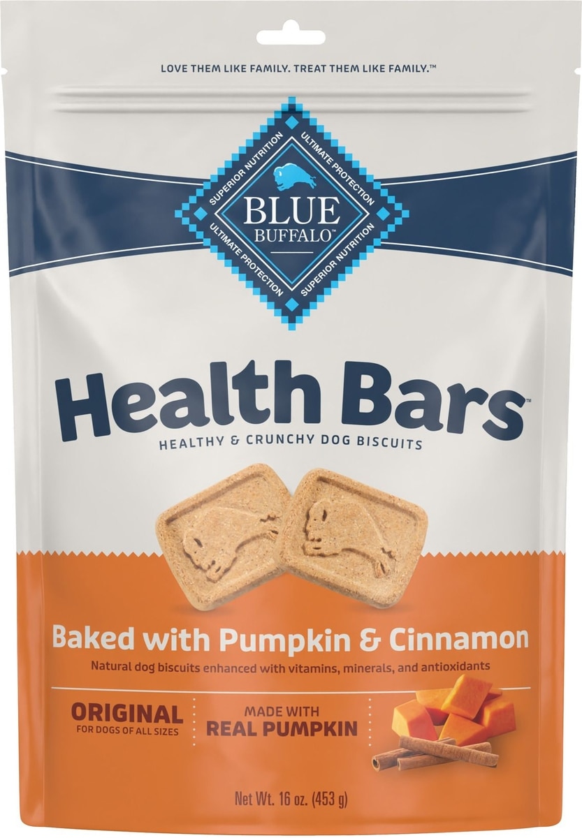 Blue Buffalo Health Bars Baked with Pumpkin & Cinnamon Dog Treats, 16-oz — A favorite of health-conscious pet parents, Blue Buffalo Health Bars Baked with Pumpkin & Cinnamon Dog Treats deliver the great taste without the corn, wheat and soy known to cause allergic reactions in some canine companions. Crafted with the finest natural ingredients like real pumpkin and cinnamon and fortified with omega-3 fatty acids, vitamins and antioxidants, these crunchy oven-baked treats are just as nutritious as they are delicious!