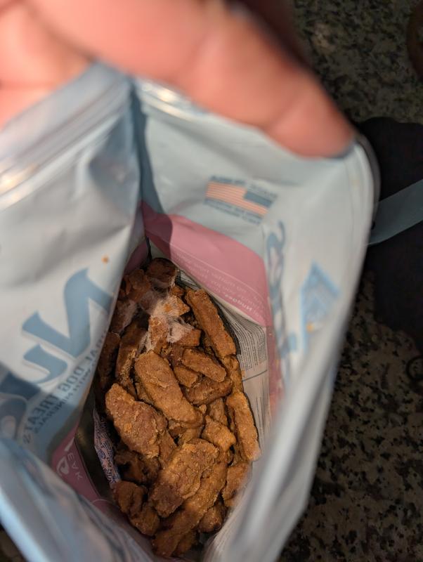 I opened the bag from my recent order and there's white mold covering the treats! Be careful. I gave a few to my dogs before I noticed the mold.