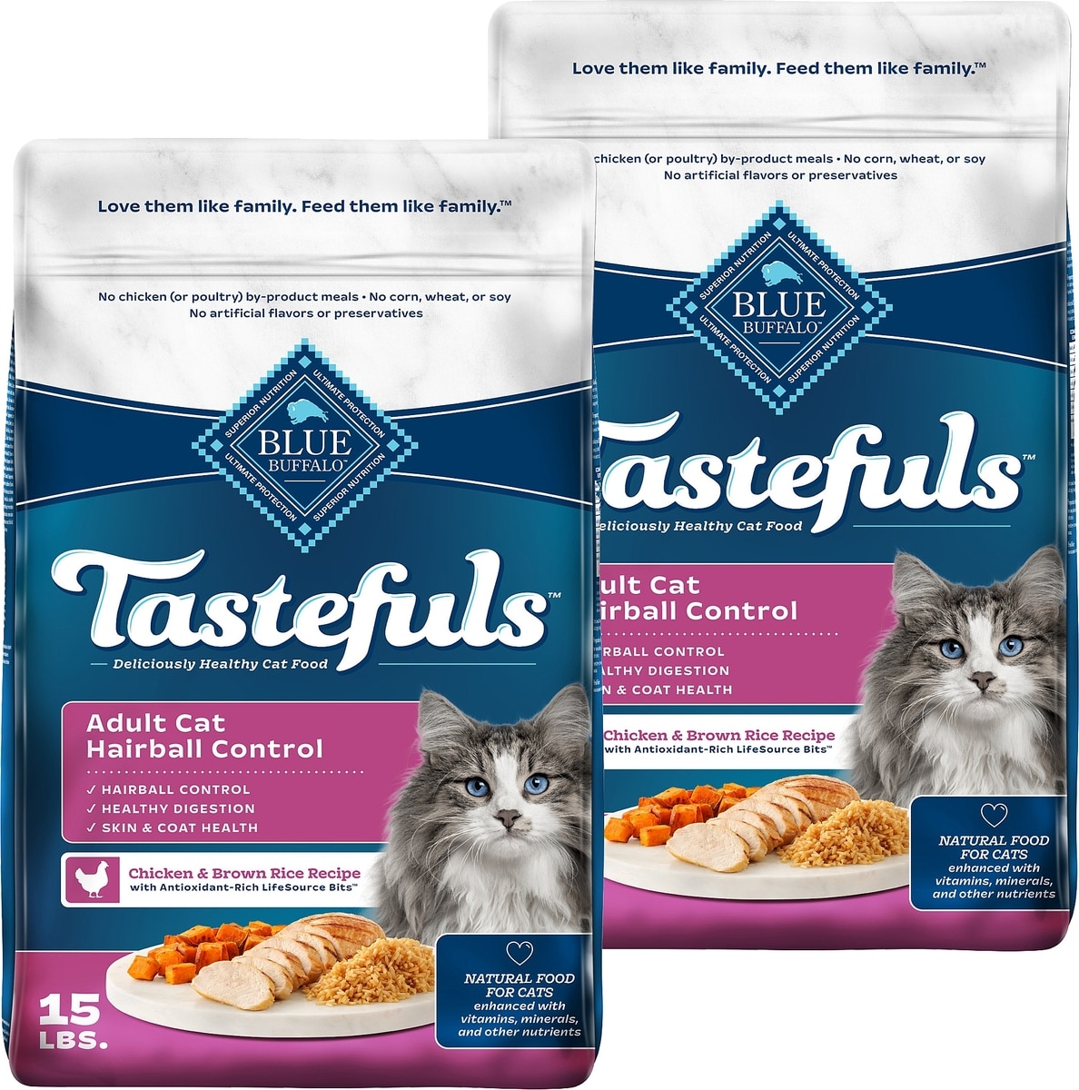 - Blue Buffalo Tastefuls Chicken & Brown Rice Recipe Adult Indoor Dry Cat Food, 15-lb bag$46.89 Chewy Price$51.99 List Price$44.55 Autoship PricePromo, New Customers Only: Spend $49+, Get $20 eGift Card