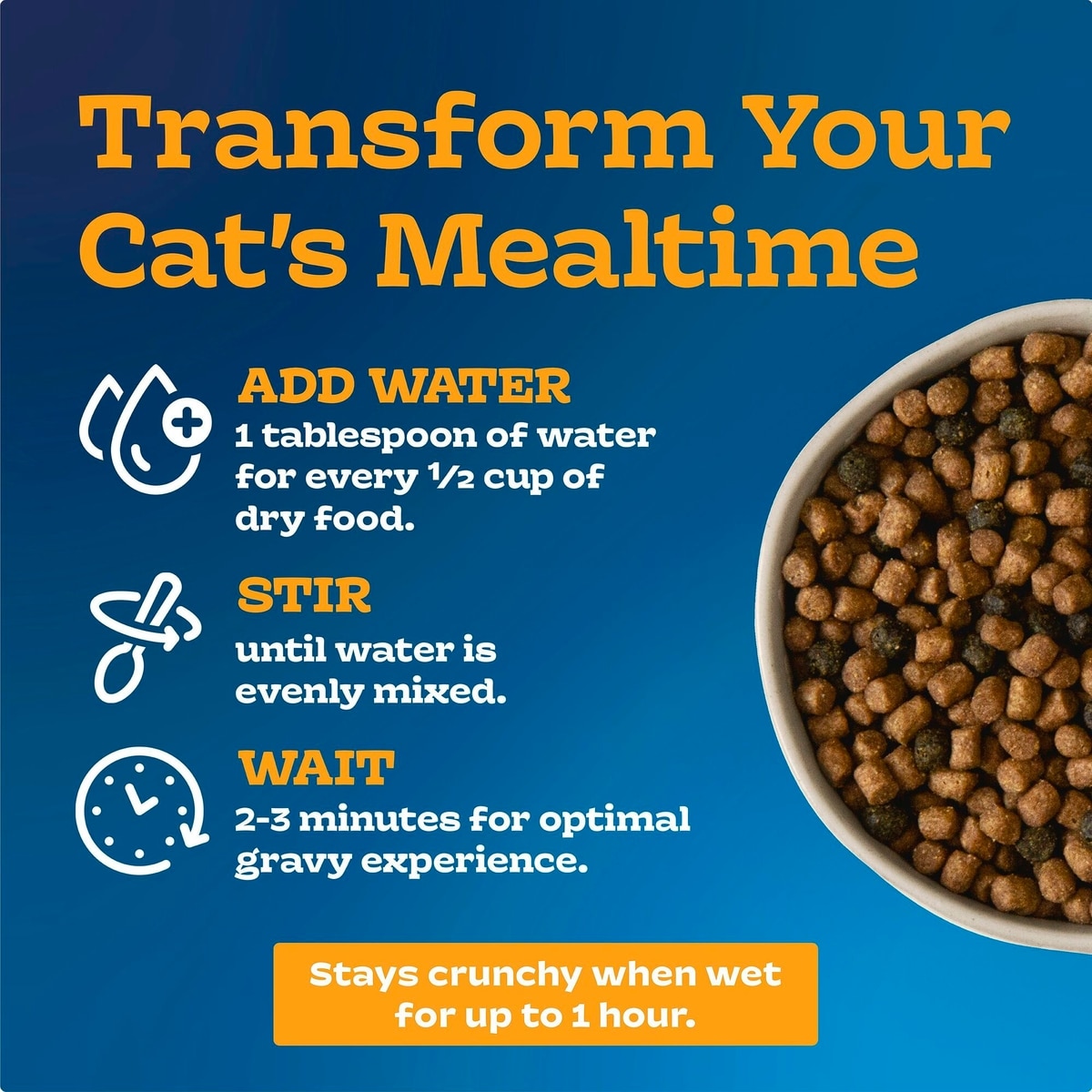 Feeding chart quantities are total per day. Use a standard 8-oz measuring cup. For making delicious gravy, add room temperature water to the recommended dry amount and mix with a spoon. Add 2 tablespoons water per cup of kibble. When adding water, divide the daily feeding amount into 2 to 3 servings per day.