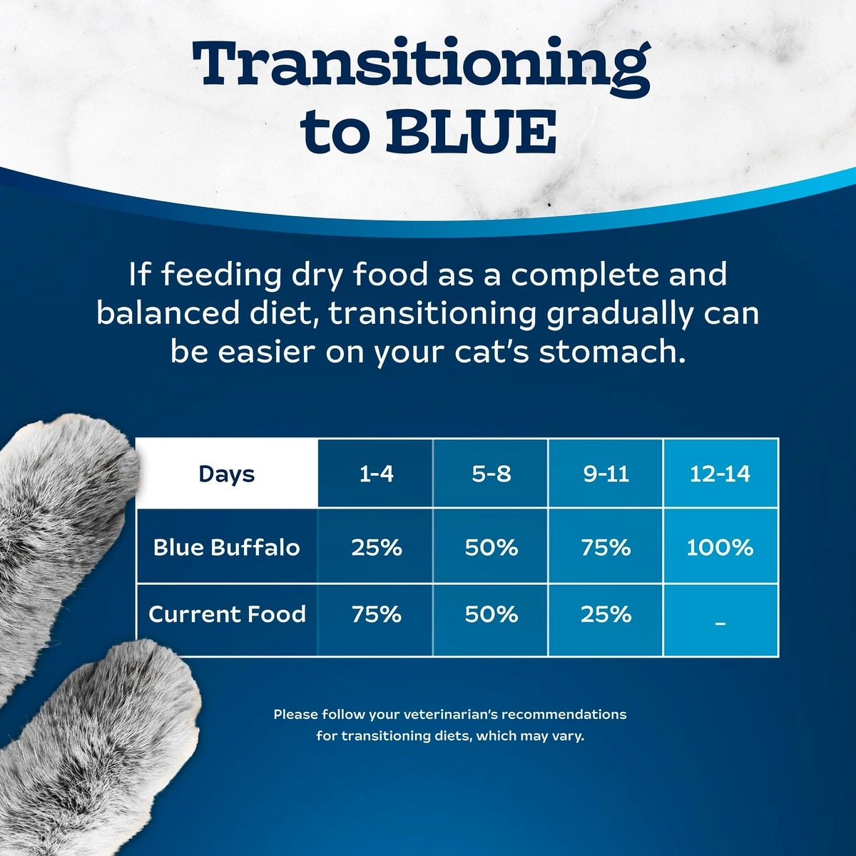 Start by mixing 25% of blue with your cat's old food, and gradually increase the proportion of blue over the next 14 days.