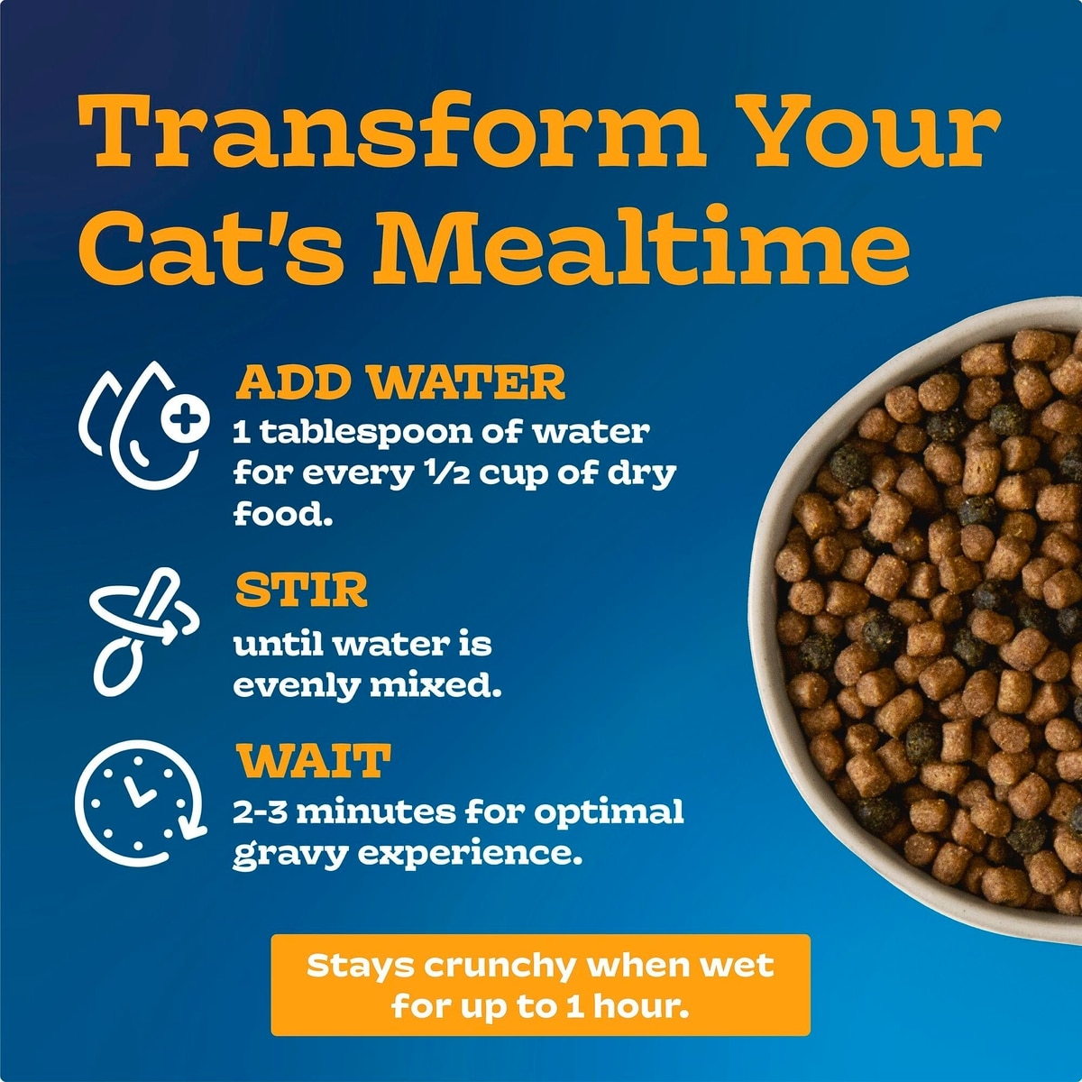 Feeding chart quantities are total per day. Use a standard 8-oz measuring cup. For making delicious gravy, add room temperature water to the recommended dry amount and mix with a spoon. Add 2 tablespoons water per cup of kibble. When adding water, divide the daily feeding amount into 2 to 3 servings per day.
