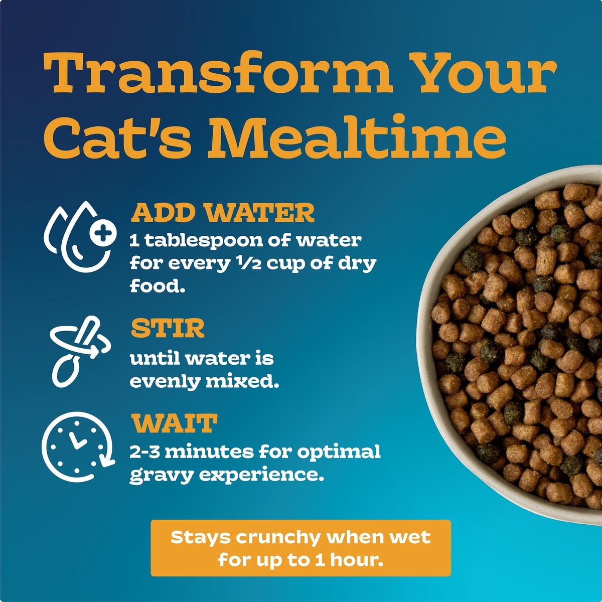 Feeding chart quantities are total per day. Use a standard 8-oz measuring cup. For making delicious gravy, add room temperature water to the recommended dry amount and mix with a spoon. Add 2 tablespoons water per cup of kibble. When adding water, divide the daily feeding amount into 2 to 3 servings per day.